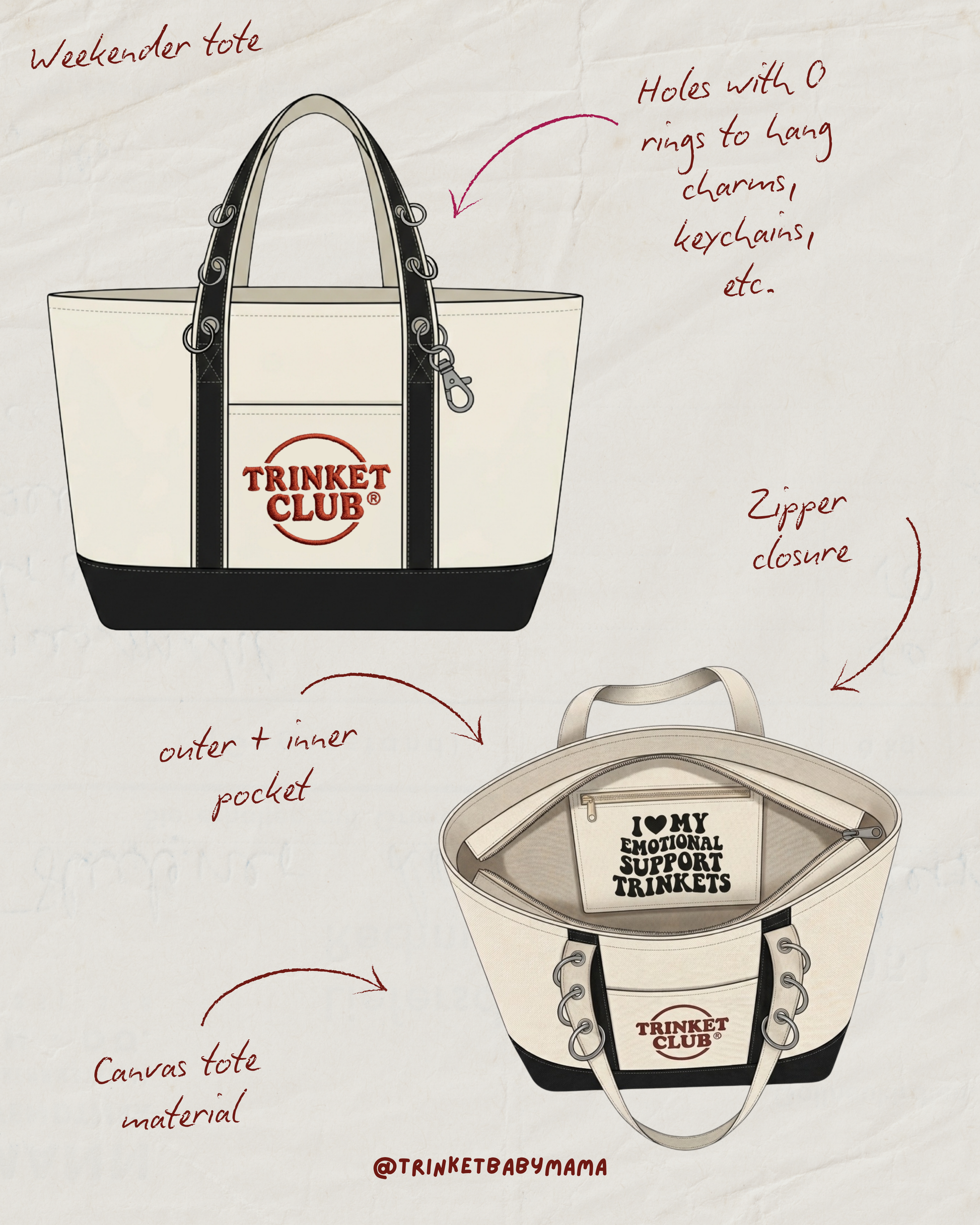 Weekender size tote, includes 6 total O-rings to hang your trinkets and charms from!